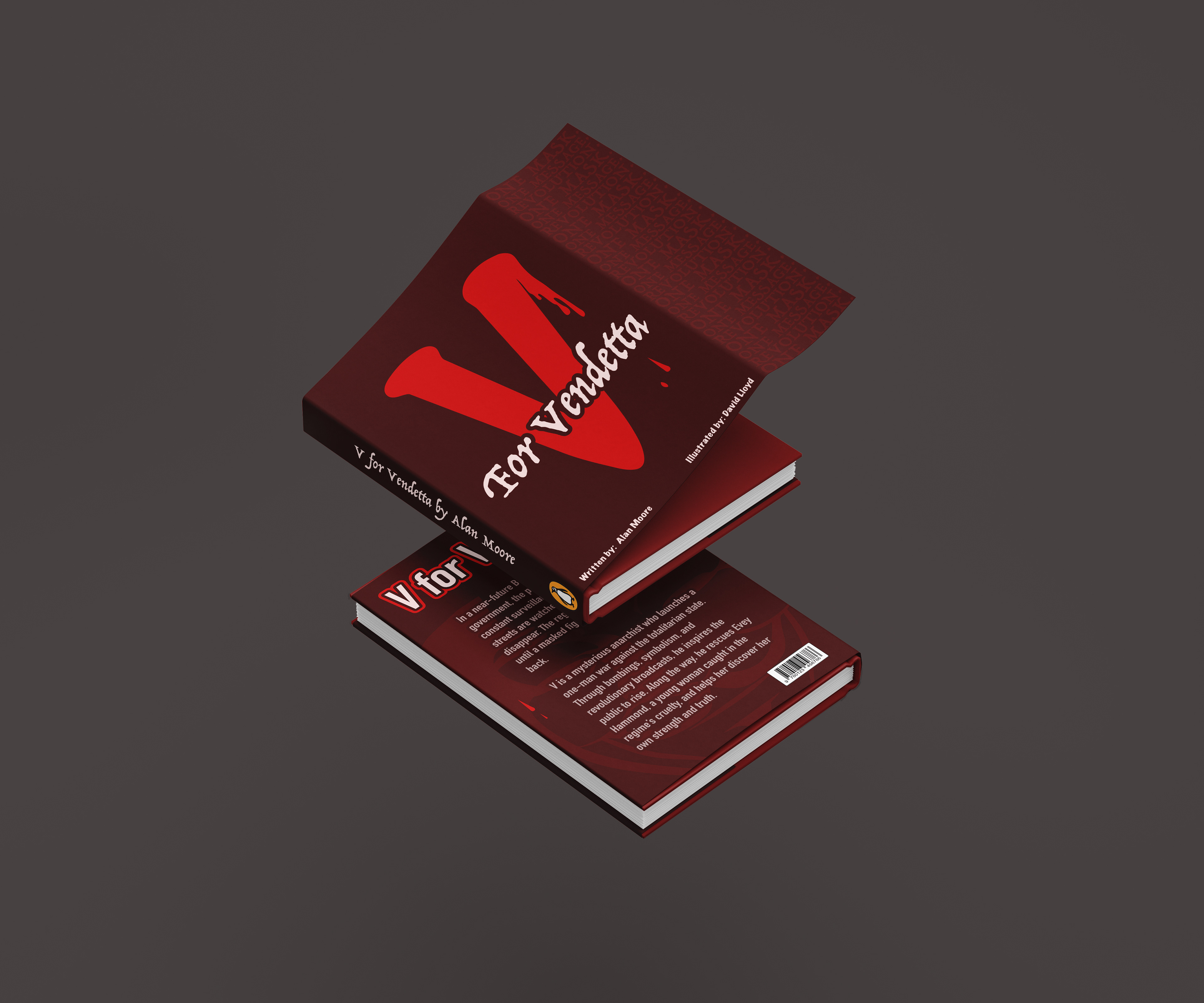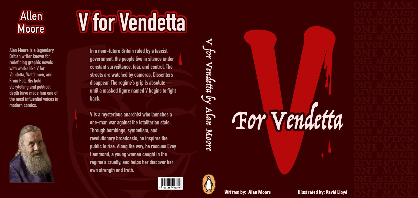 For this project I redesigned the dust jackets for a collection of three classic novels: 1984, Fahrenheit 451, and V for Vendetta. The goal was to create a cohesive set that reflects the themes and tone of each story while giving them a bold, modern visual identity. Each cover focuses on strong typographical design and graphic elements without using photos. For 1984, I emphasized the oppressive surveillance of Big Brother with a spotlight and bold red background, while repeated text in the background suggests control and omnipresence. For Fahrenheit 451, I used torn textures, fire motifs, and layered typography to represent censorship, destruction, and rebellion. For V for Vendetta, I built the design around themes of resistance and revolution, using the Guy Fawkes mask and repeating words "One Mask, One Revolution" in the background.